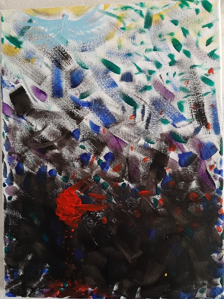 Pinté el cuadro de arriba el 15 de enero, 2020 y escribí el poema dos días después. Si no se han dado cuenta todavía, hay un punto diminuto de luz en medio de su Lugar Profundamente Oscuro. Porque ninguna oscuridad jamás será tan densa que la Luz del tamaño de la cabeza de alfiler no la pueda penetrar.
