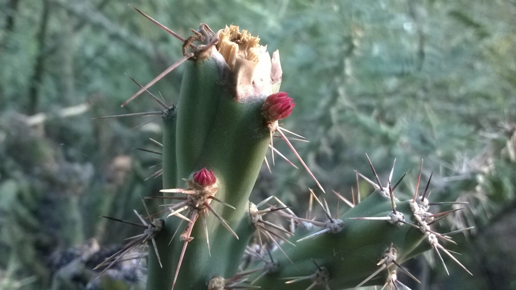 In 2015 when I was in Tucson for a visit, I realized that the cholla cactus behind the wall of my parents’ backyard was quite overgrown and unruly. For years, my mother had trimmed it regularly so that it never grew higher than the wall, and she made sure that there was a safe passage for the utility personnel to walk on between the two rows of cholla. But this visit, she was almost 81 years old and had not been able to trim them for, she estimated, four years. With more than a little trepidation, I offered to trim them. They were about 12 inches taller than I was and, because they were so dense, I could only partially open the gate to go behind the wall to begin. The day I started the project, I began by talking to the cactus, “I just want you to know, that my cutting you back is not an act of violence. I’m trimming you back to how you have always been, and I will be as gentle as I can, so please be kind to me. Also, for the record, I’m more intimidated by you than you ever will be by these pruning shears.” It may sound crazy, but that conversation worked. It took me six mornings to leave the path through the cholla suitable to walk through and to cut the overgrown tops back down to my height. Not once did any of the arms fall on me, nor did I back into or brush against any of them. And… I only got two tiny thorns in my fingers the whole time. What’s more, it ended up being what felt like a spiritual encounter. I quickly learned to be in communion with that which had scared me; even to the point of knowing when and where to move out of the way as I cut the branches of thorny arms and they fell to the ground. I learned to dance with the cholla!