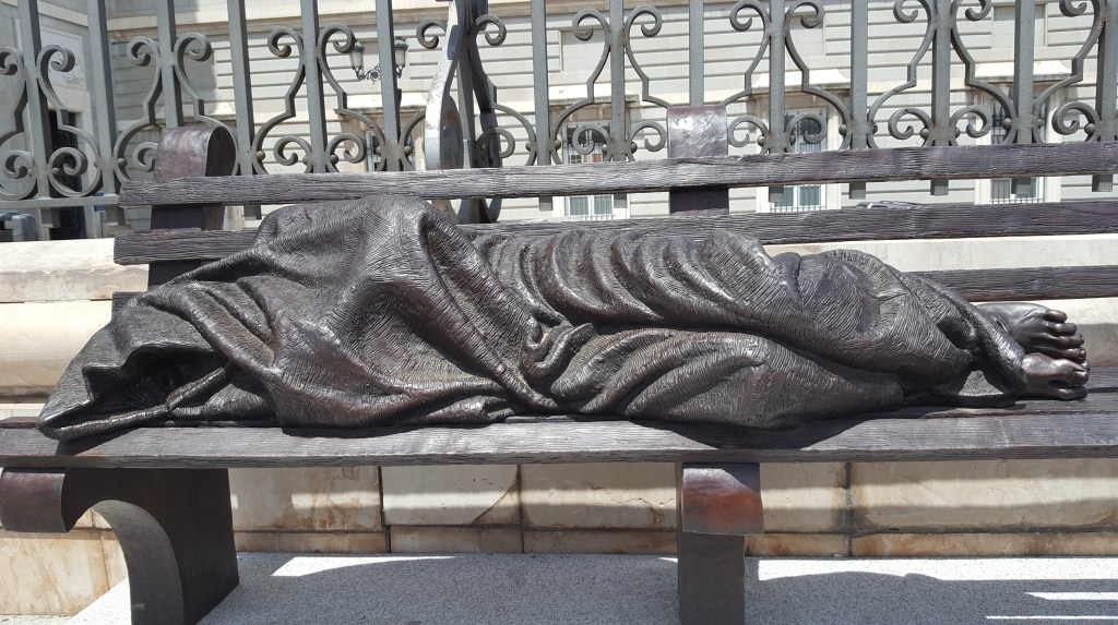 Tomé la foto de esta publicación en un jardín pequeño, escondido, a un lado de la Catedral en Madrid. Primero me impresionó el realismo de la escultura, y de ahí las heridas de los pies….